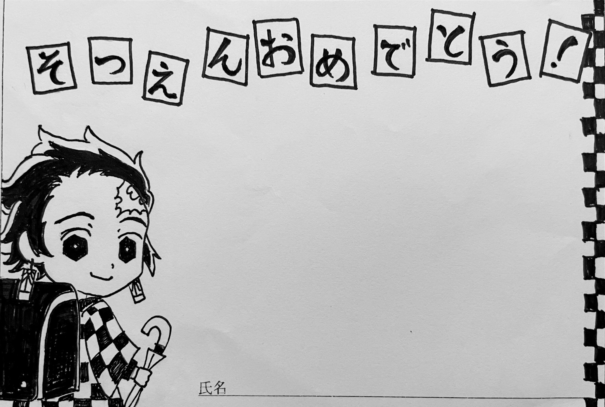 トモクサユウタ 子どもが卒園するので幼稚園の企画で親からの文集があるらしく うちの枠はぼくがネットのイラスト見ながらアレンジして炭治郎が小学校に行くところを描いてみた 背負うのは禰 豆子じゃなく持つのは刀ではない T Co j3vuds0x
